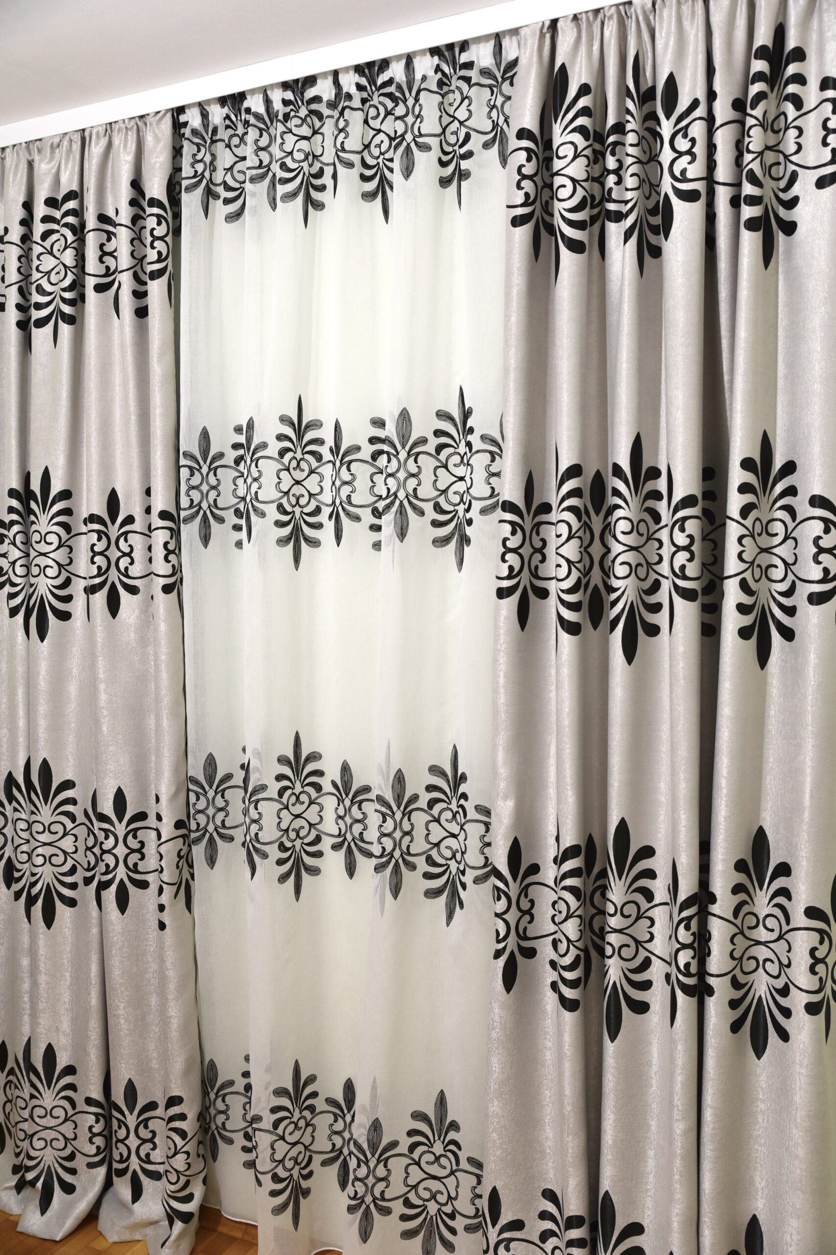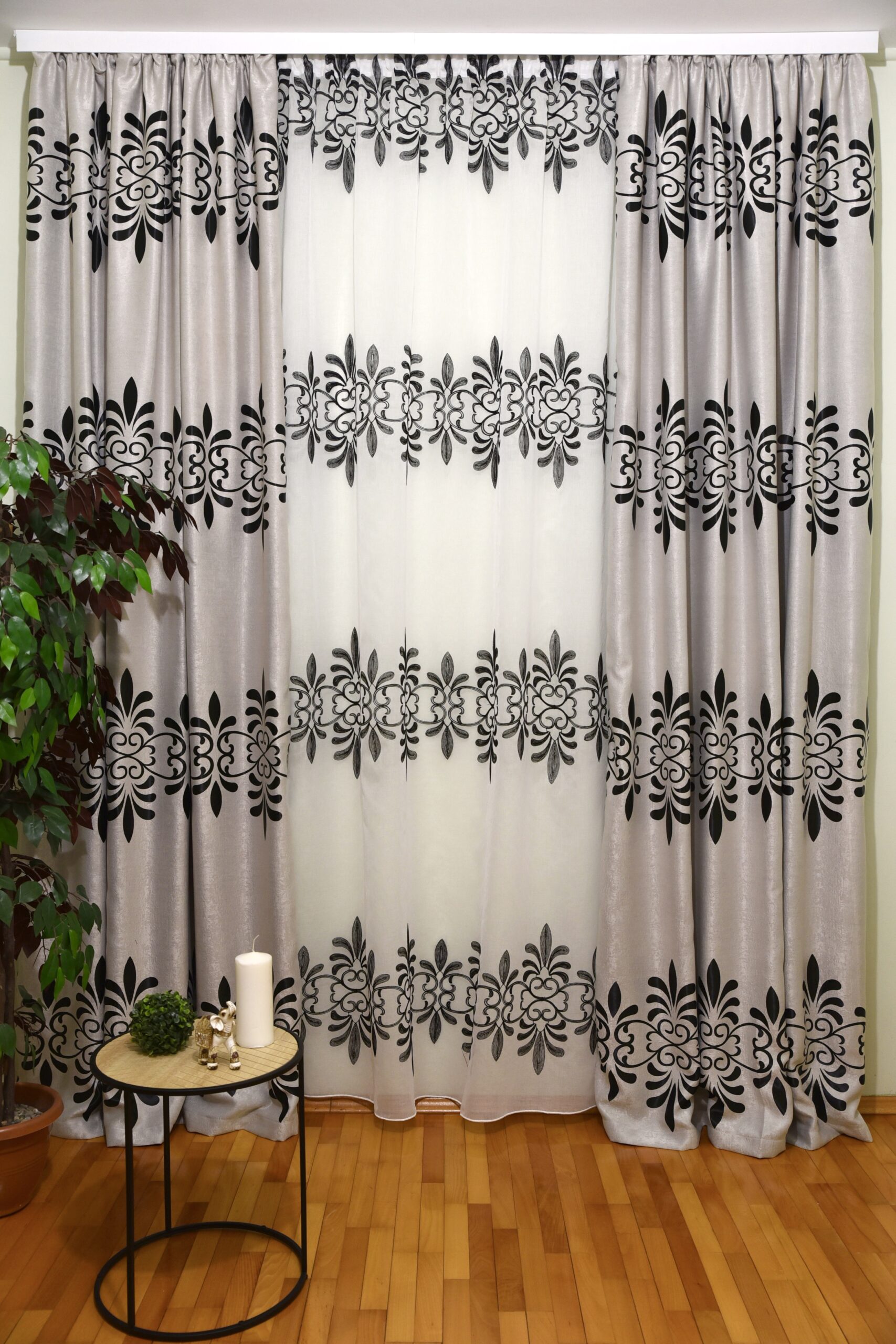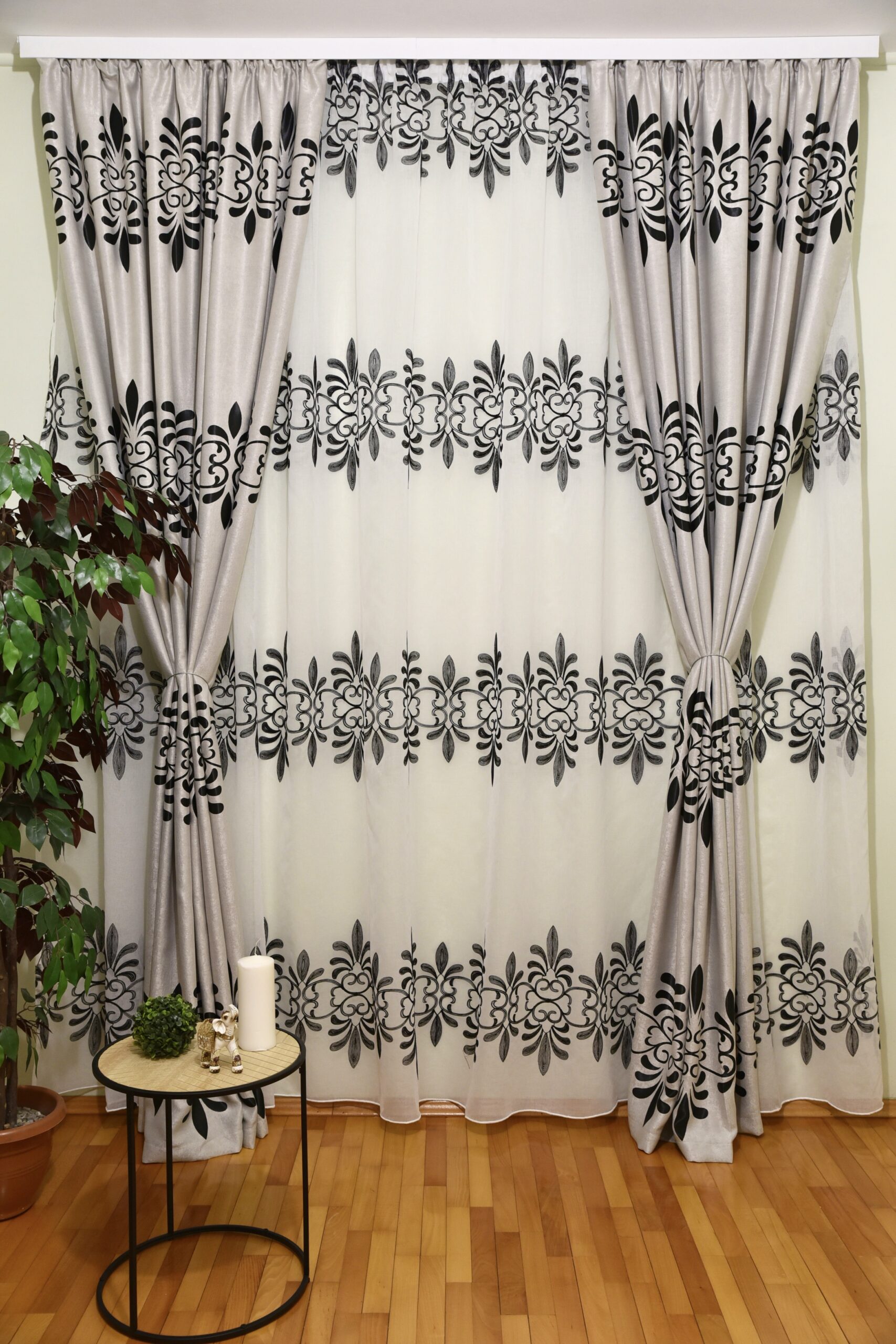 Oferă-i casei tale aspectul mult visat cu setul nostru compus dintr-o perdea din in brodat și doua draperii din black-out cu model coloane orizontale.